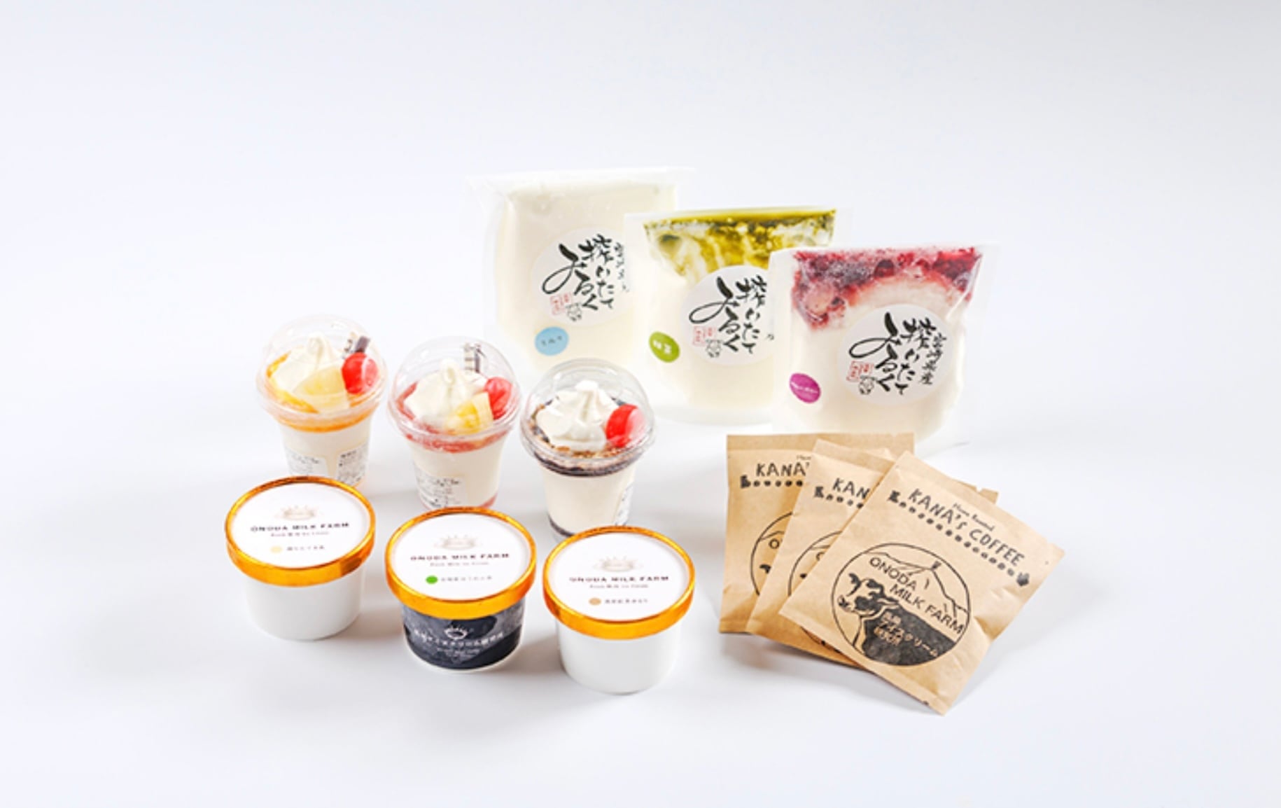 定番のミニパフェやカップアイス、そして珍しいもみもみスパウトや自家焙煎のドリップパックが揃った、まさに幸せなひとときを提供します。